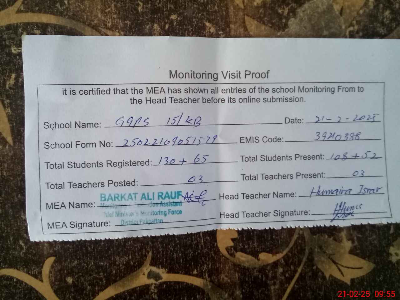 | Attendance Register | Head Teacher | MEA with School | Visit Proof |