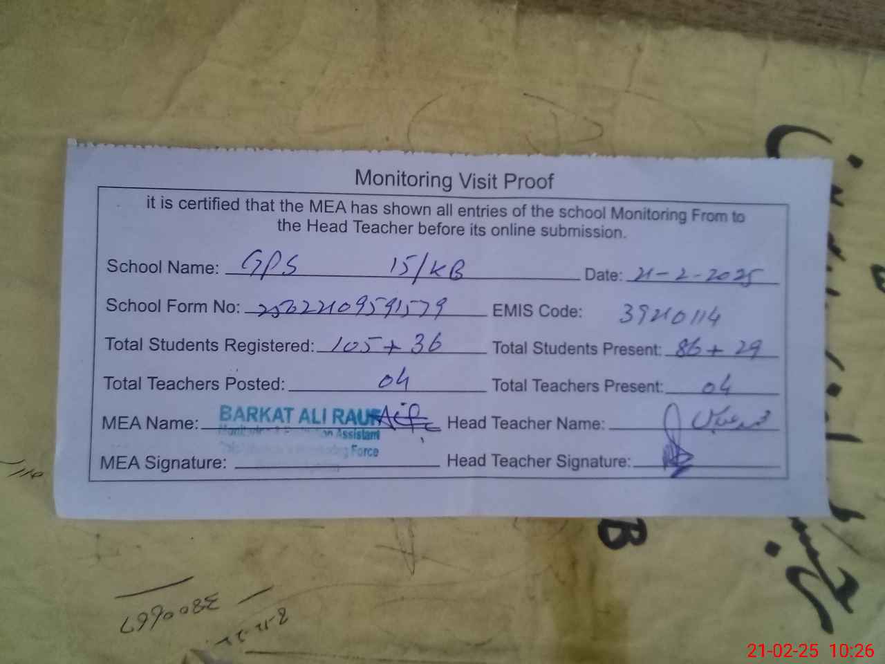 | EMIS Code: 39210114 | Name of School: GPS CHAK NO 15 KB | |||
