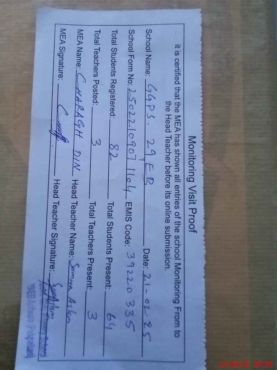 | Attendance Register | Head Teacher | MEA with School | Visit Proof |