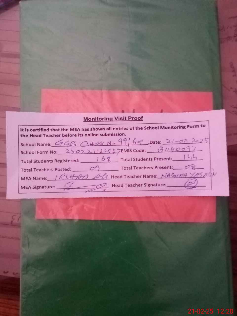 | Attendance Register | Head Teacher | MEA with School | Visit Proof |