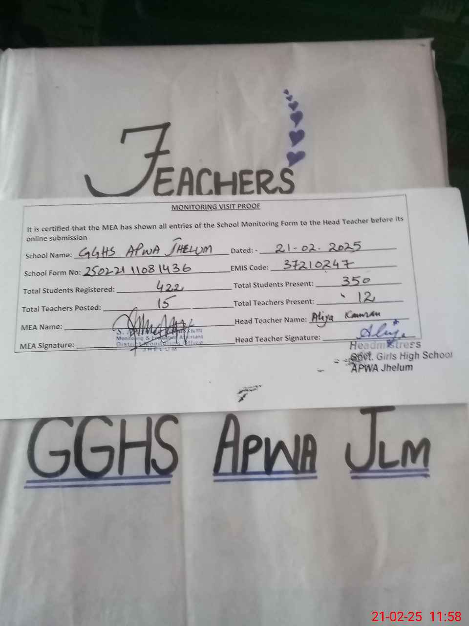 | EMIS Code: 37210247 | Name of School: GGHS APWA JHELUM | |||
