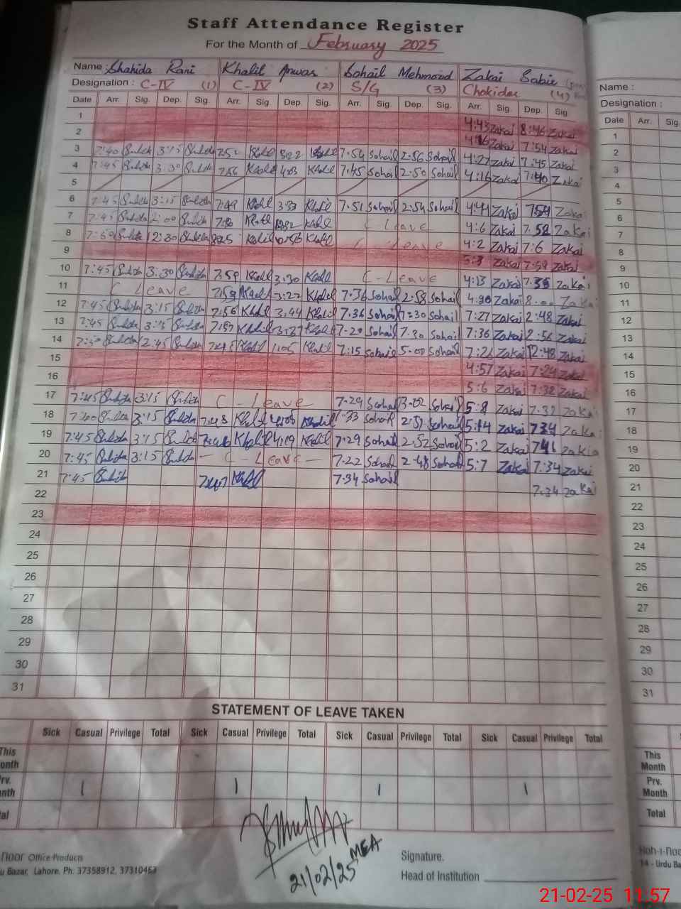 | CNIC | Full Name | Designation | R/C | Absence During Last Calender Month |
