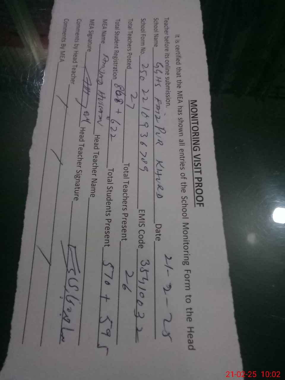 | Attendance Register | Head Teacher | MEA with School | Visit Proof |