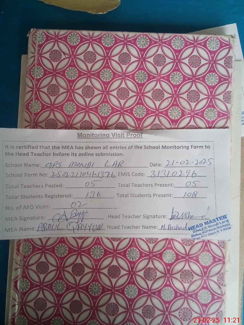 | EMIS Code: 31310296 | Name of School: GPS MONDI LAR (After Noon) | |||