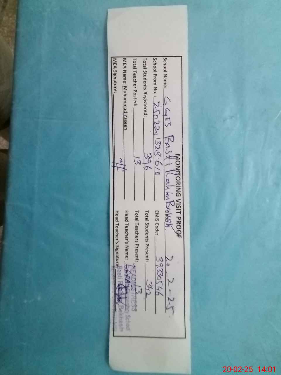 | Attendance Register | Head Teacher | MEA with School | Visit Proof |