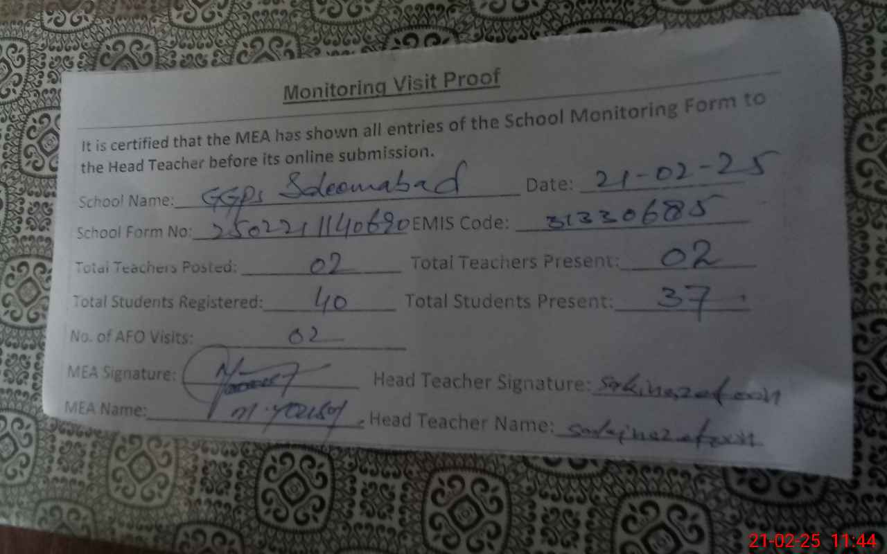 | EMIS Code: 31330685 | Name of School: GGPS SALEEM ABAD (ABAD PUR) | |||