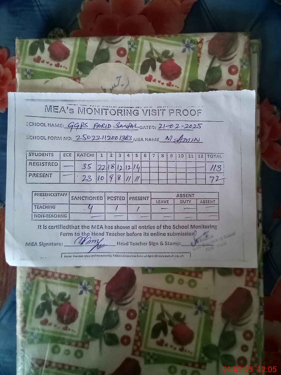 | EMIS Code: 36430358 | Name of School: GGPS FARID SANPAL, TULAMBA | |||