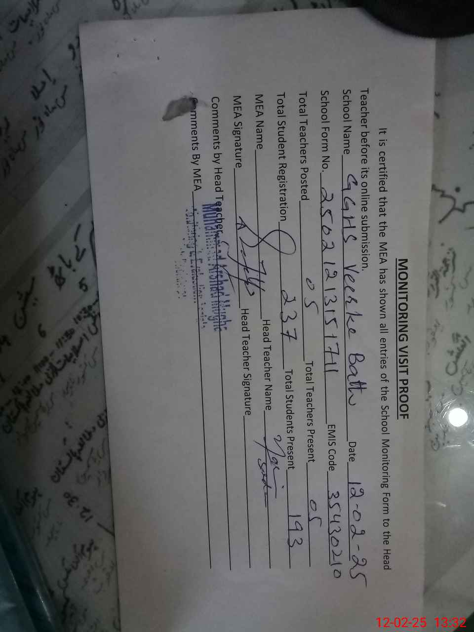 | Attendance Register | Head Teacher | MEA with School | Visit Proof |