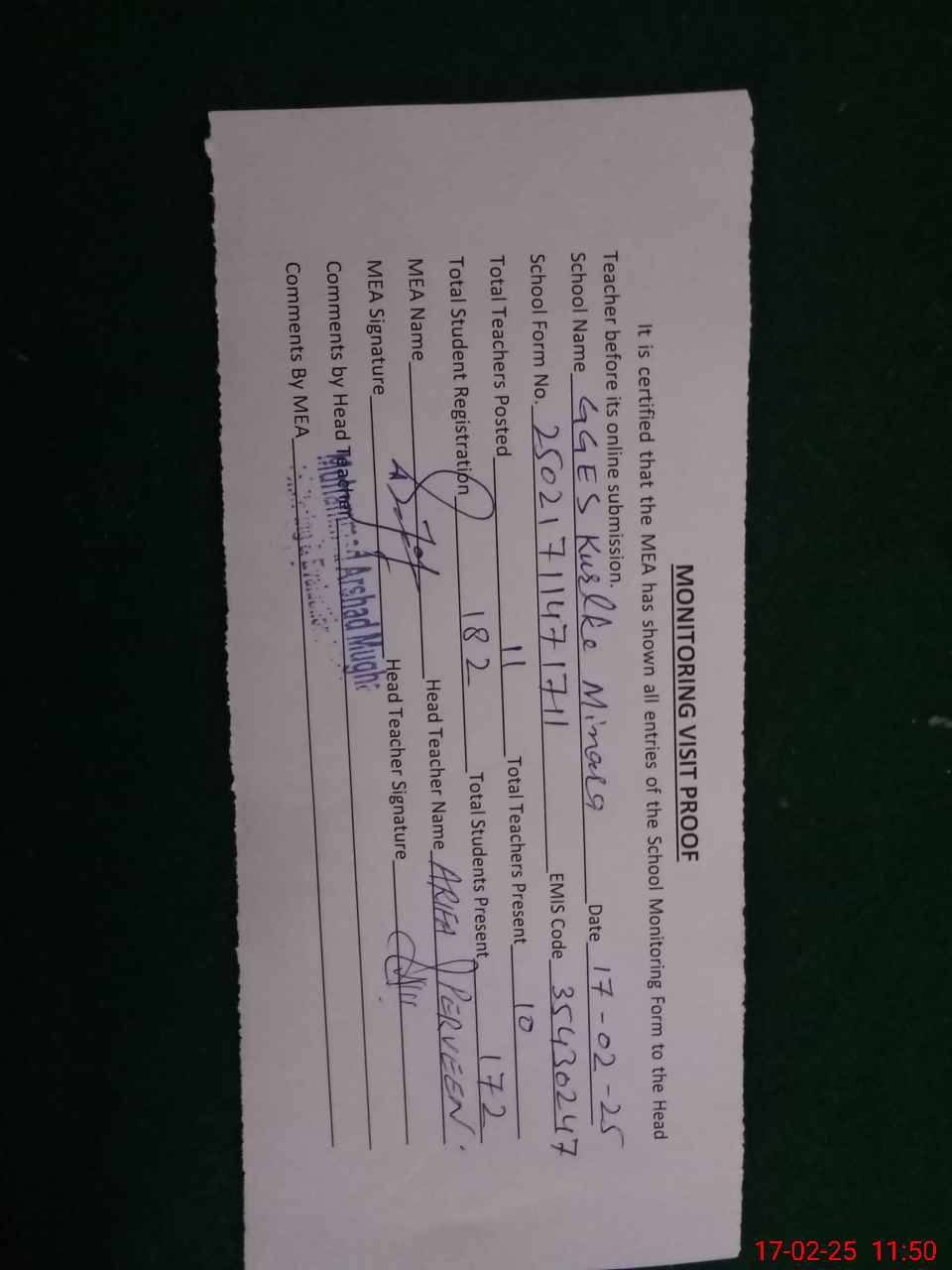 | Attendance Register | Head Teacher | MEA with School | Visit Proof |