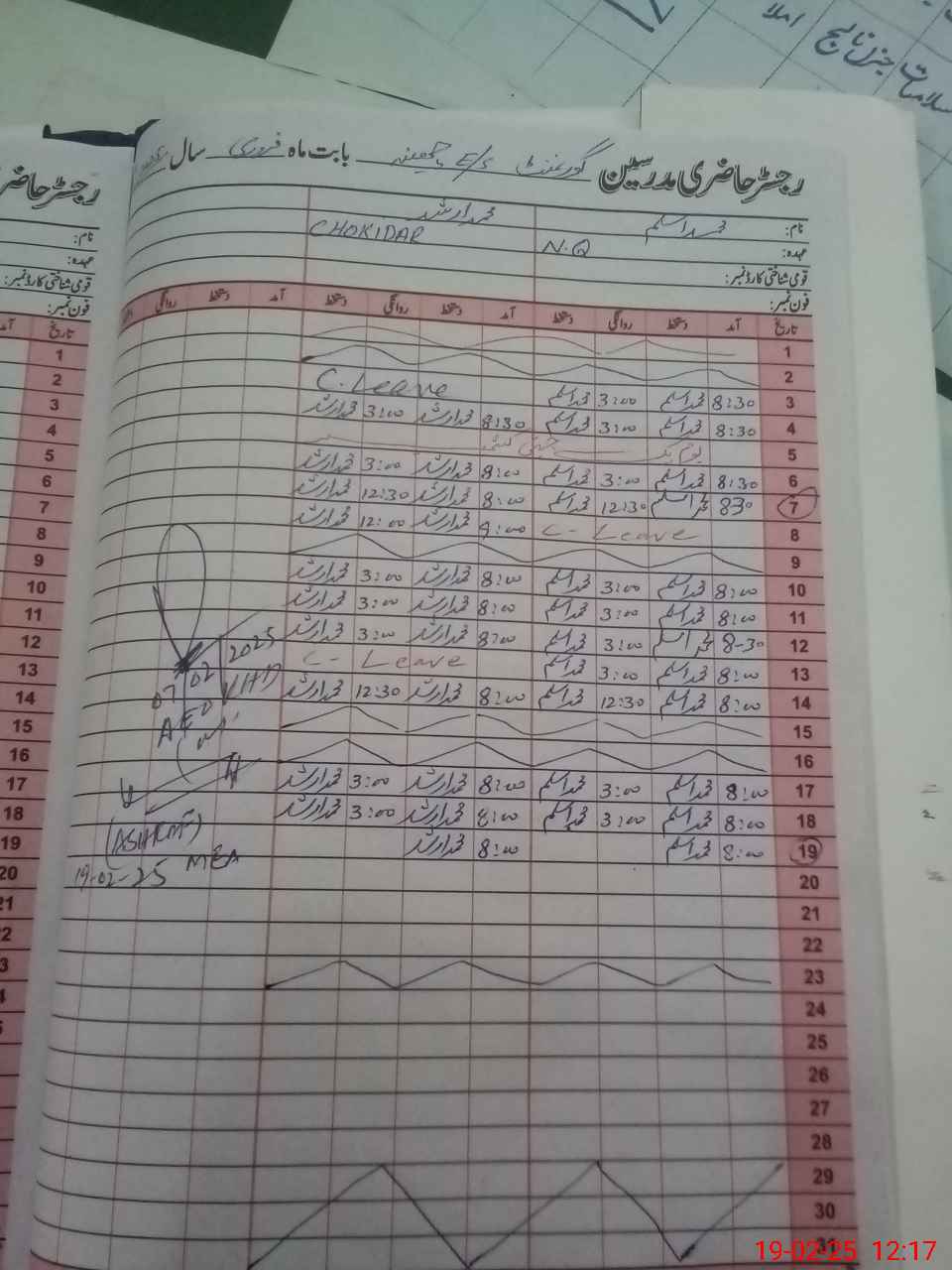 | CNIC | Full Name | Designation | R/C | Absence during last cal. month |