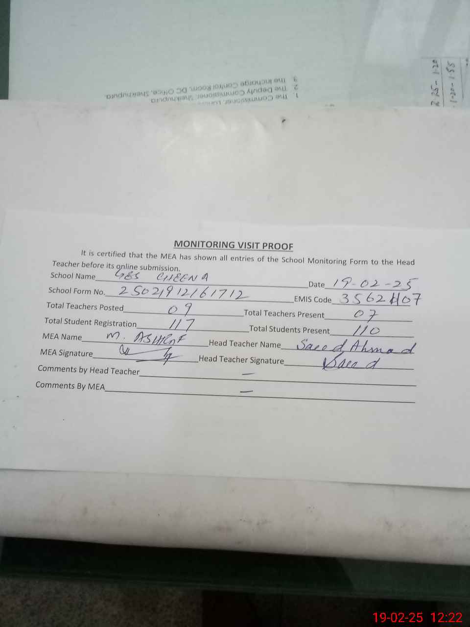 | Certified that this School was Inspected by the Undersigned MEA/DMO Today and the Information Stated Above is as Per Record. | |||||