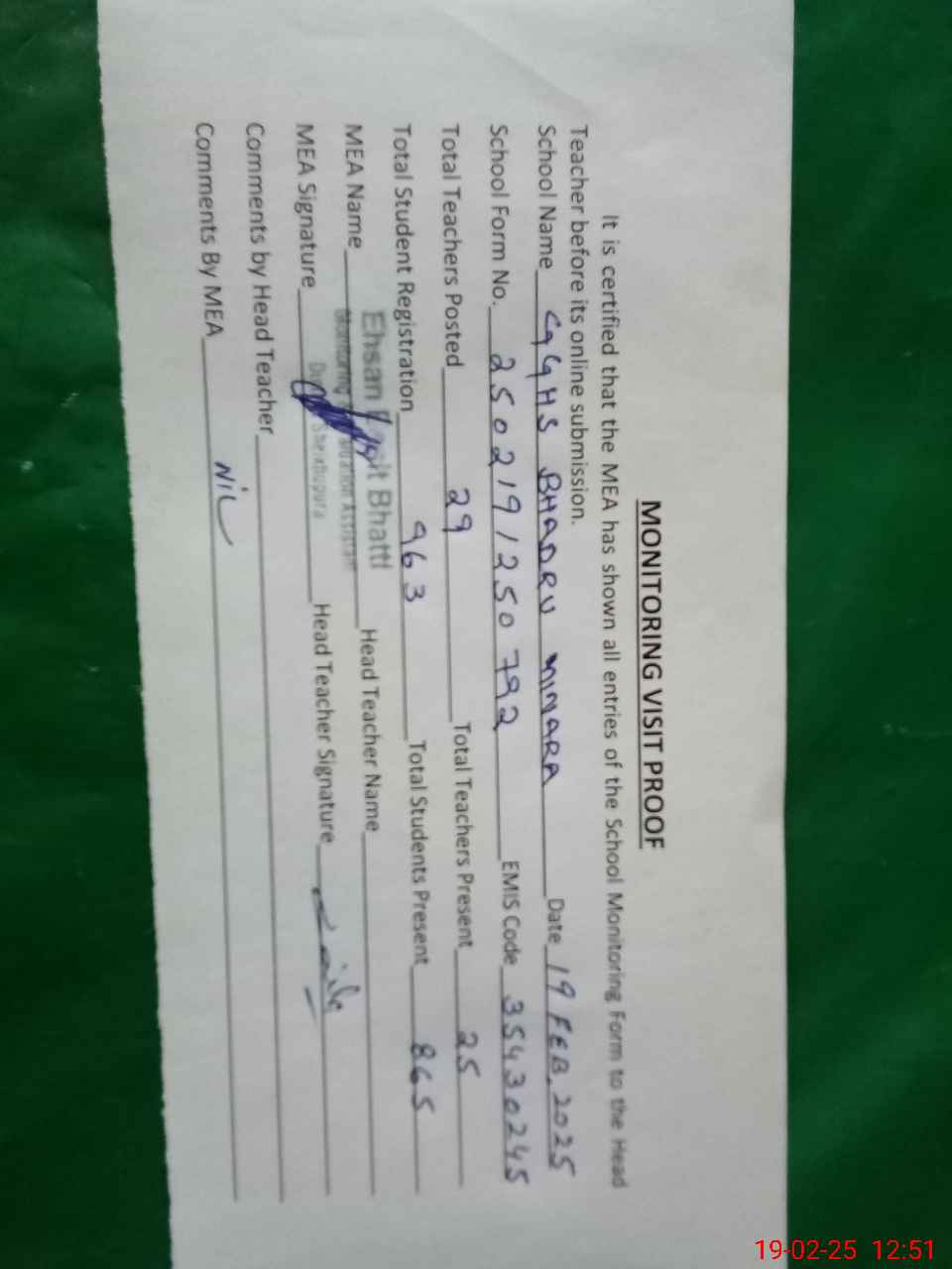 | Attendance Register | Head Teacher | MEA with School | Visit Proof |