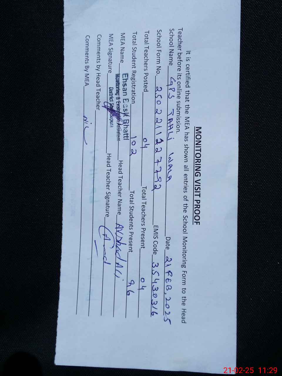 | EMIS Code: 35430316 | Name of School: GPS TAHLI WALA | |||
