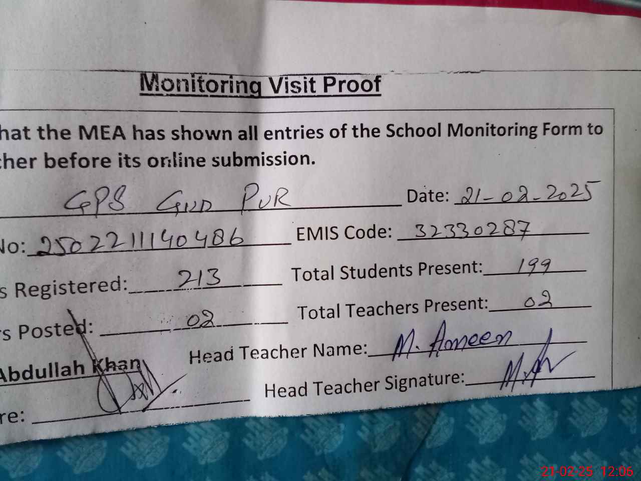 | Attendance Register | Head Teacher | MEA with School | Visit Proof |