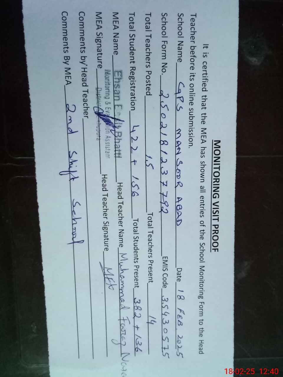 | EMIS Code: 35430575 | Name of School: GPS MANSOOR ABAD | |||