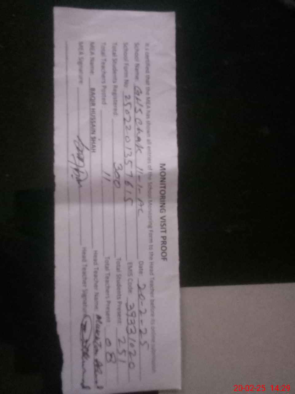 | Attendance Register | Head Teacher | MEA with School | Visit Proof |