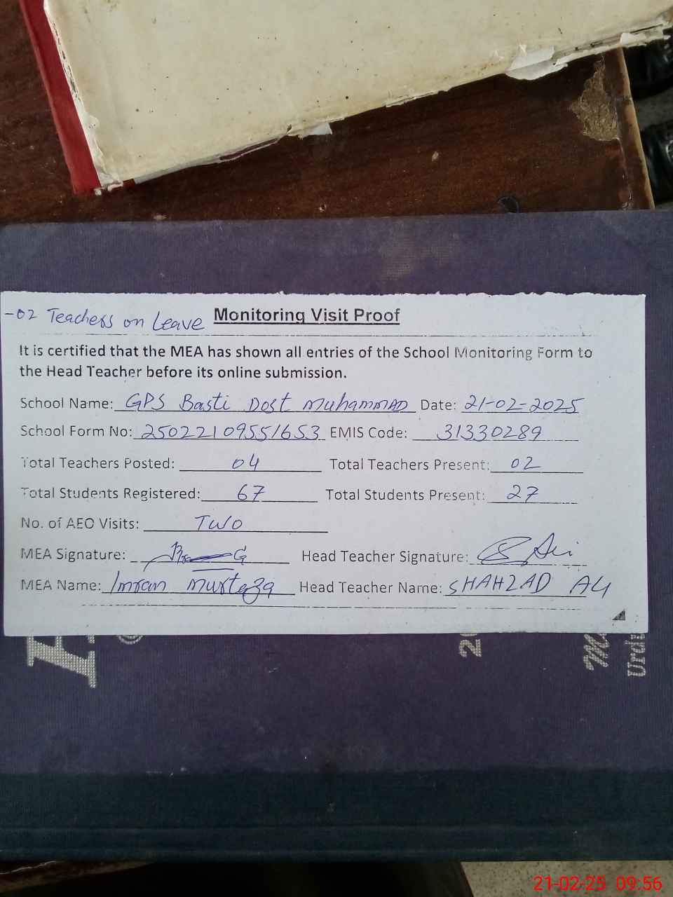 | EMIS Code: 31330289 | Name of School: GPS BASTI DOST MUHAMMAD | |||