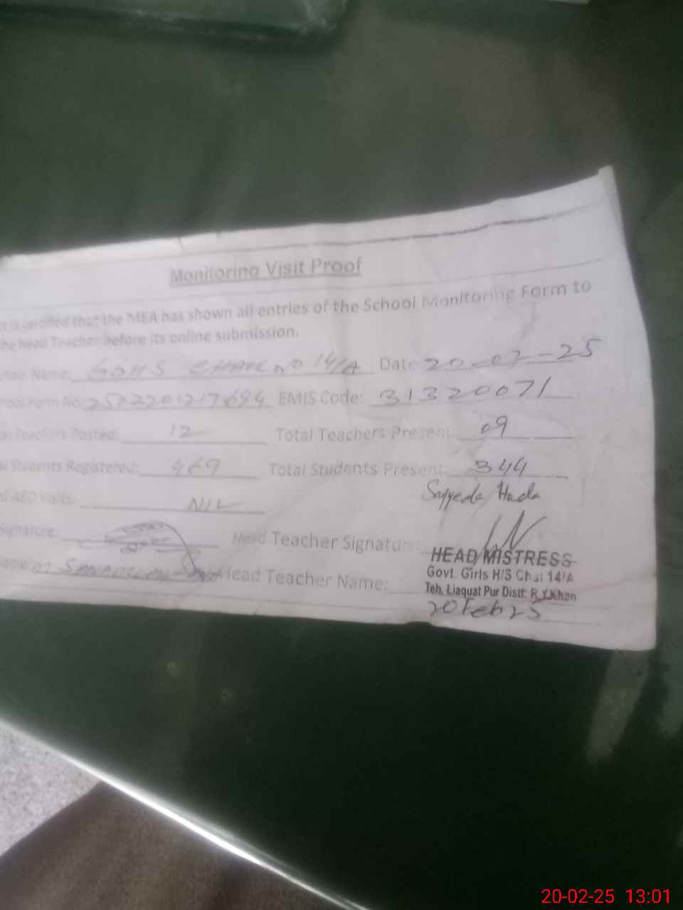 | EMIS Code: 31320071 | Name of School: GGHS CHAK NO. 14/A | |||