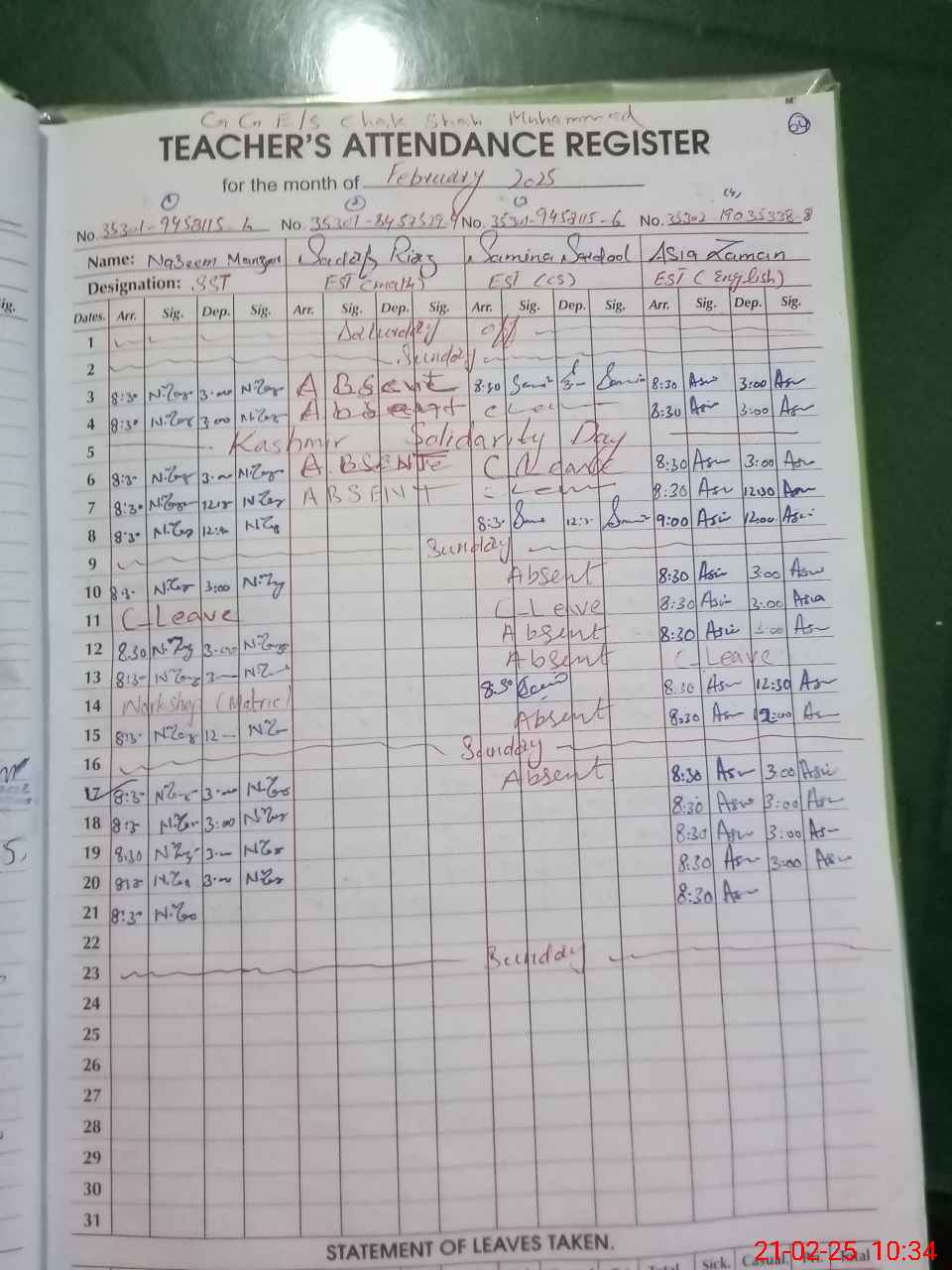 | 35**** | Sa**** Ri**** | Regular | 0 | 0 | 31 | 0 | 0 | 0 | 0 | 0 | 0 | Absent (Un-Authorized) | |