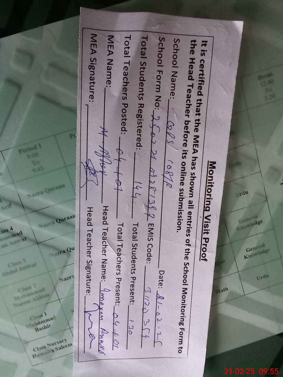 | Attendance Register | Head Teacher | MEA with School | Visit Proof |