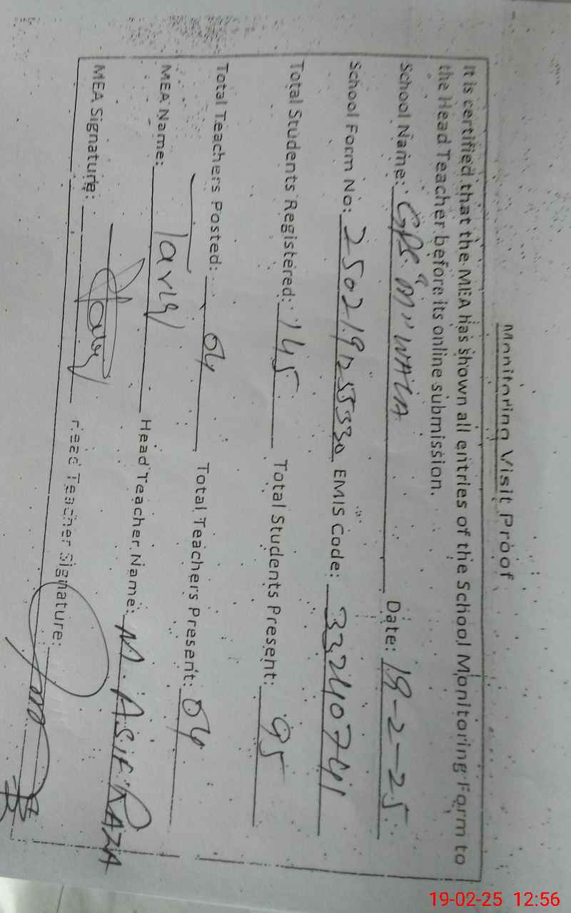 | Certified that this School was Inspected by the Undersigned MEA/DMO Today and the Information Stated Above is as Per Record. | |||||