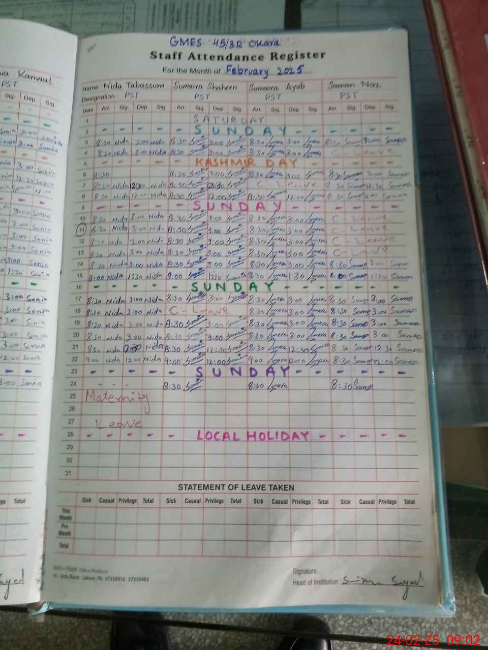 | Leave | Duty | Absent | Maternity | Medical | Ex- Pak |