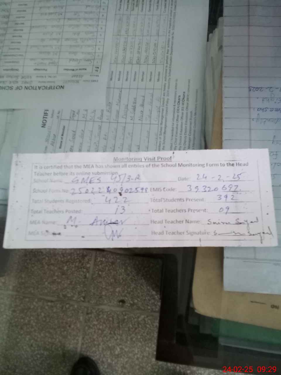 | Attendance Register | Head Teacher | MEA with School | Visit Proof |
