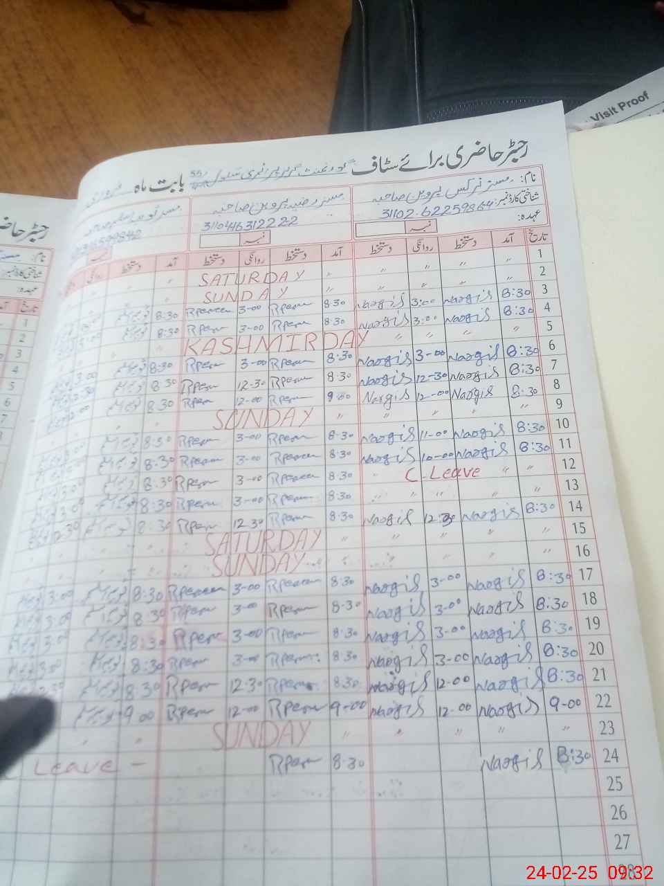 | CNIC | Full Name | Designation | R/C | Absence During Last Calender Month |