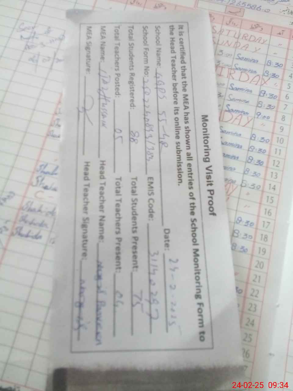 | Attendance Register | Head Teacher | MEA with School | Visit Proof |
