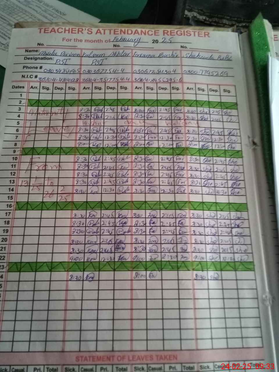 | CNIC | Full Name | Designation | R/C | Absence During Last Calender Month |