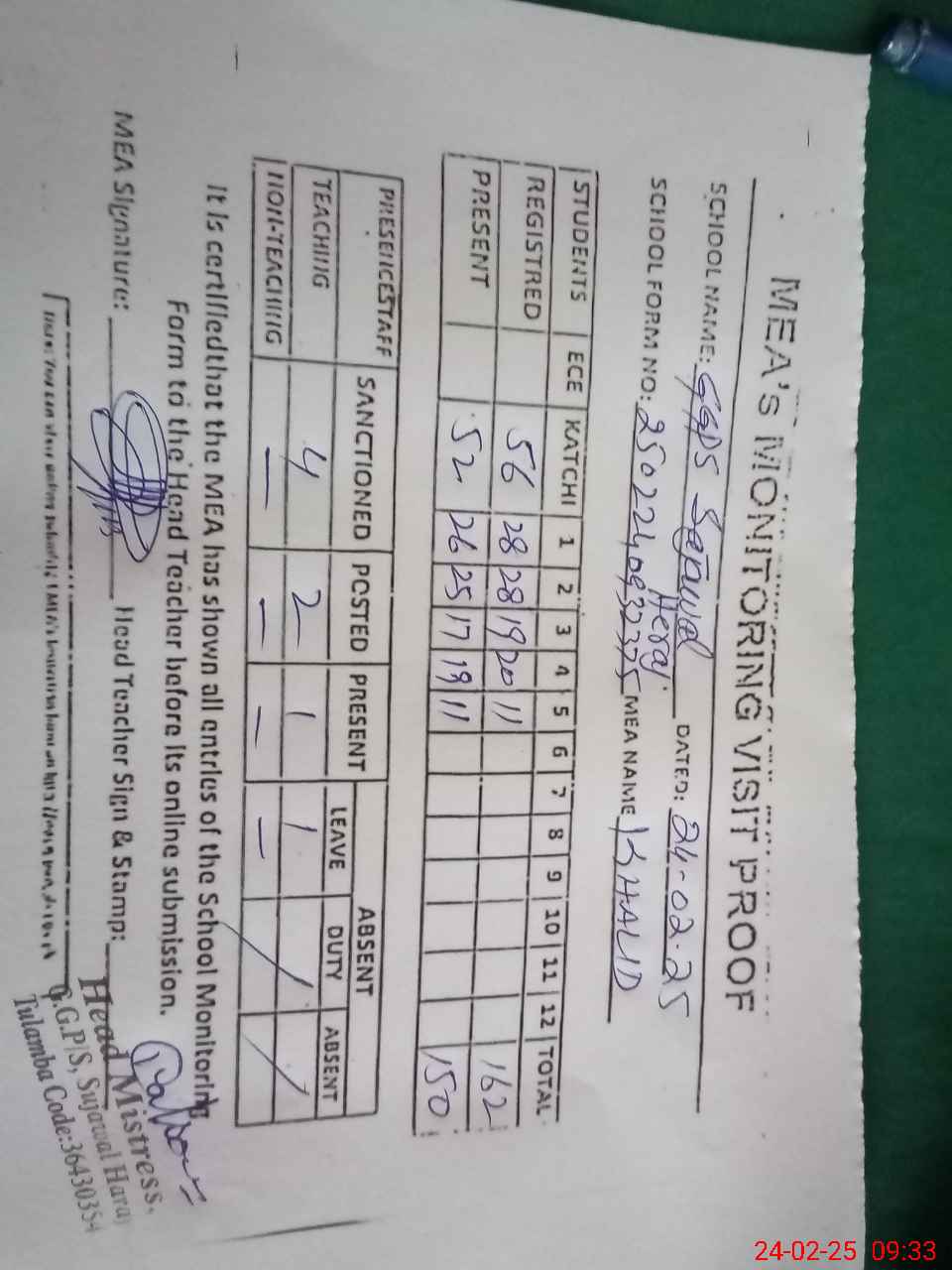 | Attendance Register | Head Teacher | MEA with School | Visit Proof |