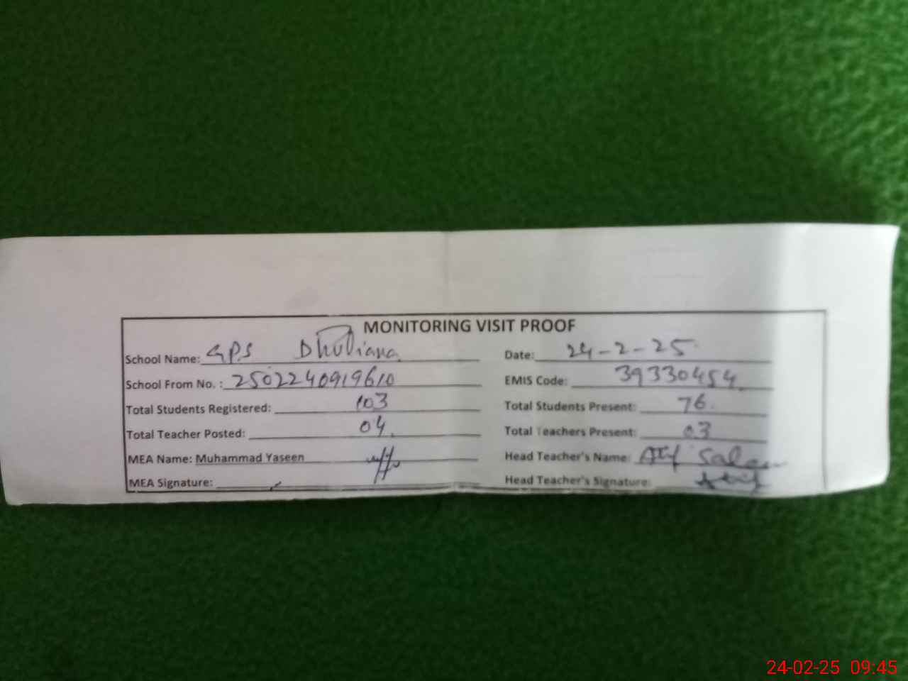 | EMIS Code: 39330454 | Name of School: GPS DHULYANA | |||