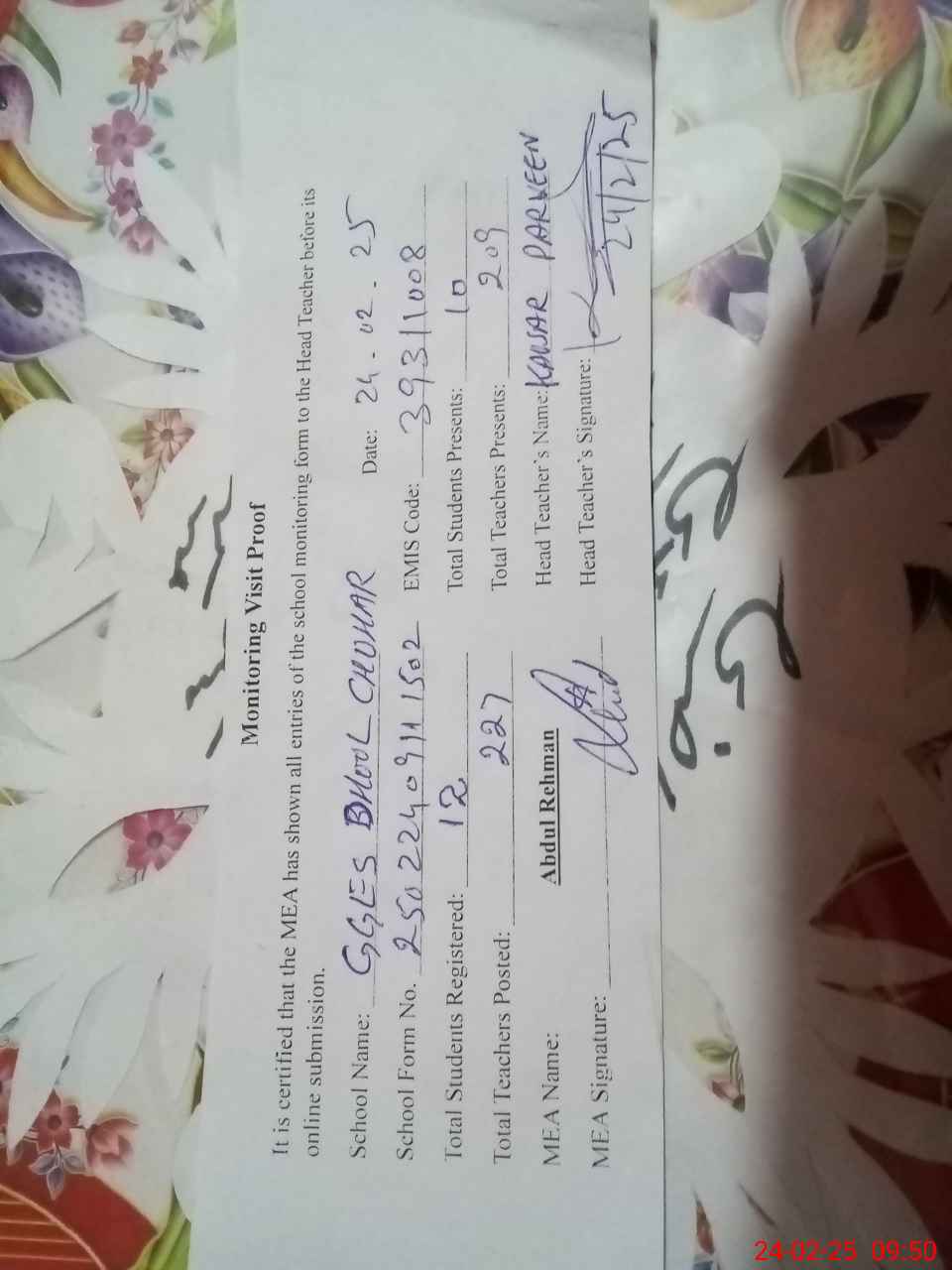 | Attendance Register | Head Teacher | MEA with School | Visit Proof |