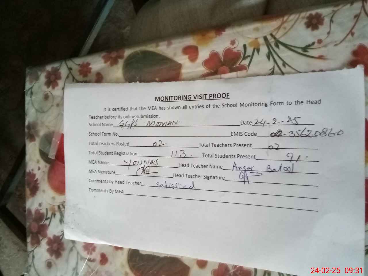 | Certified that this School was Inspected by the Undersigned MEA/DMO Today and the Information Stated Above is as Per Record. | |||||
