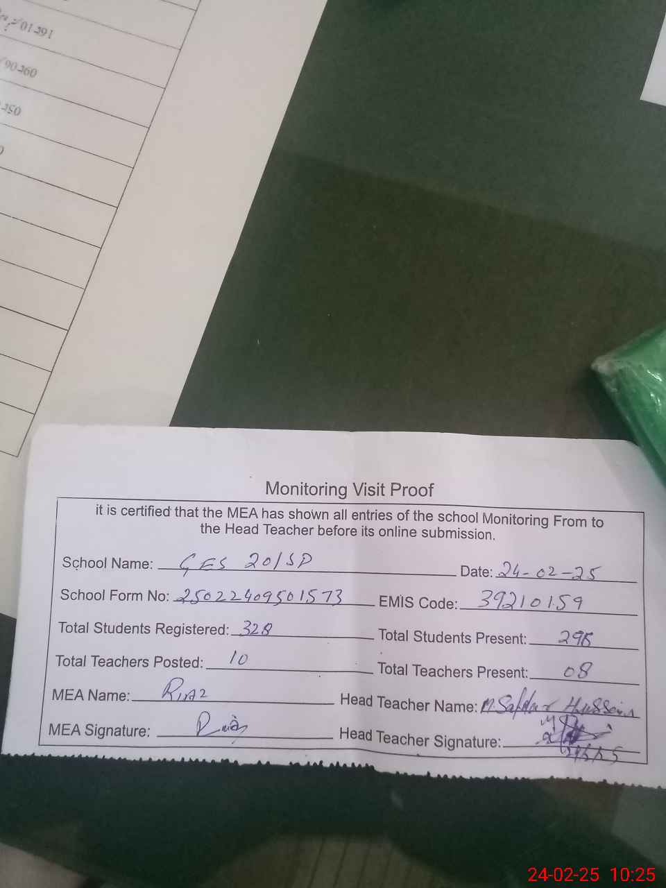 | Attendance Register | Head Teacher | MEA with School | Visit Proof |