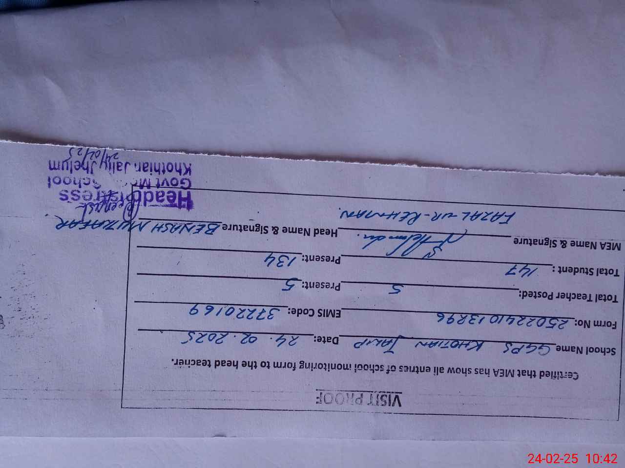 | Attendance Register | Head Teacher | MEA with School | Visit Proof |