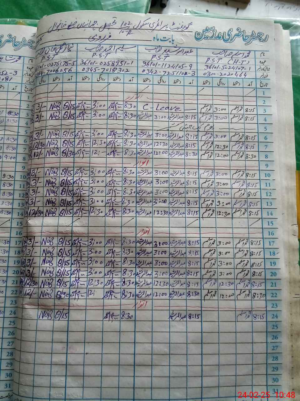 | CNIC | Full Name | Designation | R/C | Absence During Last Calender Month |