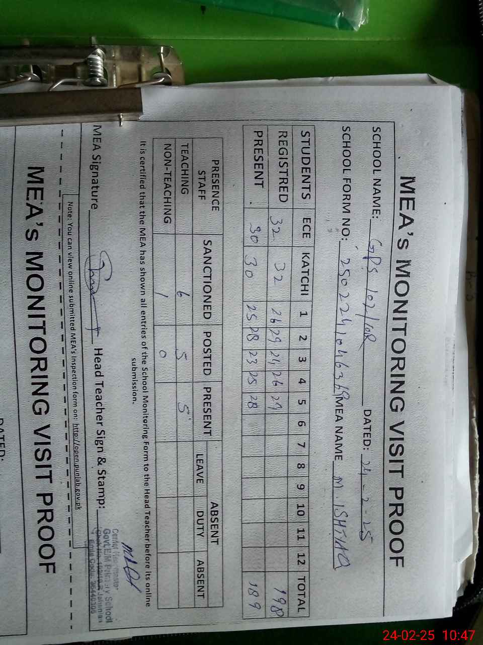 | Attendance Register | Head Teacher | MEA with School | Visit Proof |