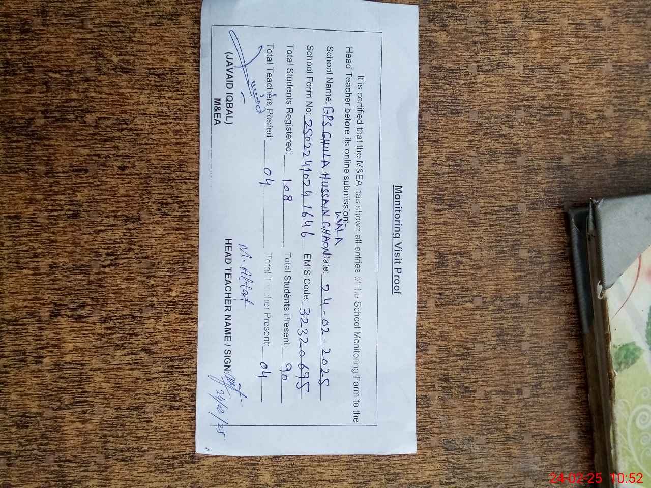 | Attendance Register | Head Teacher | MEA with School | Visit Proof |