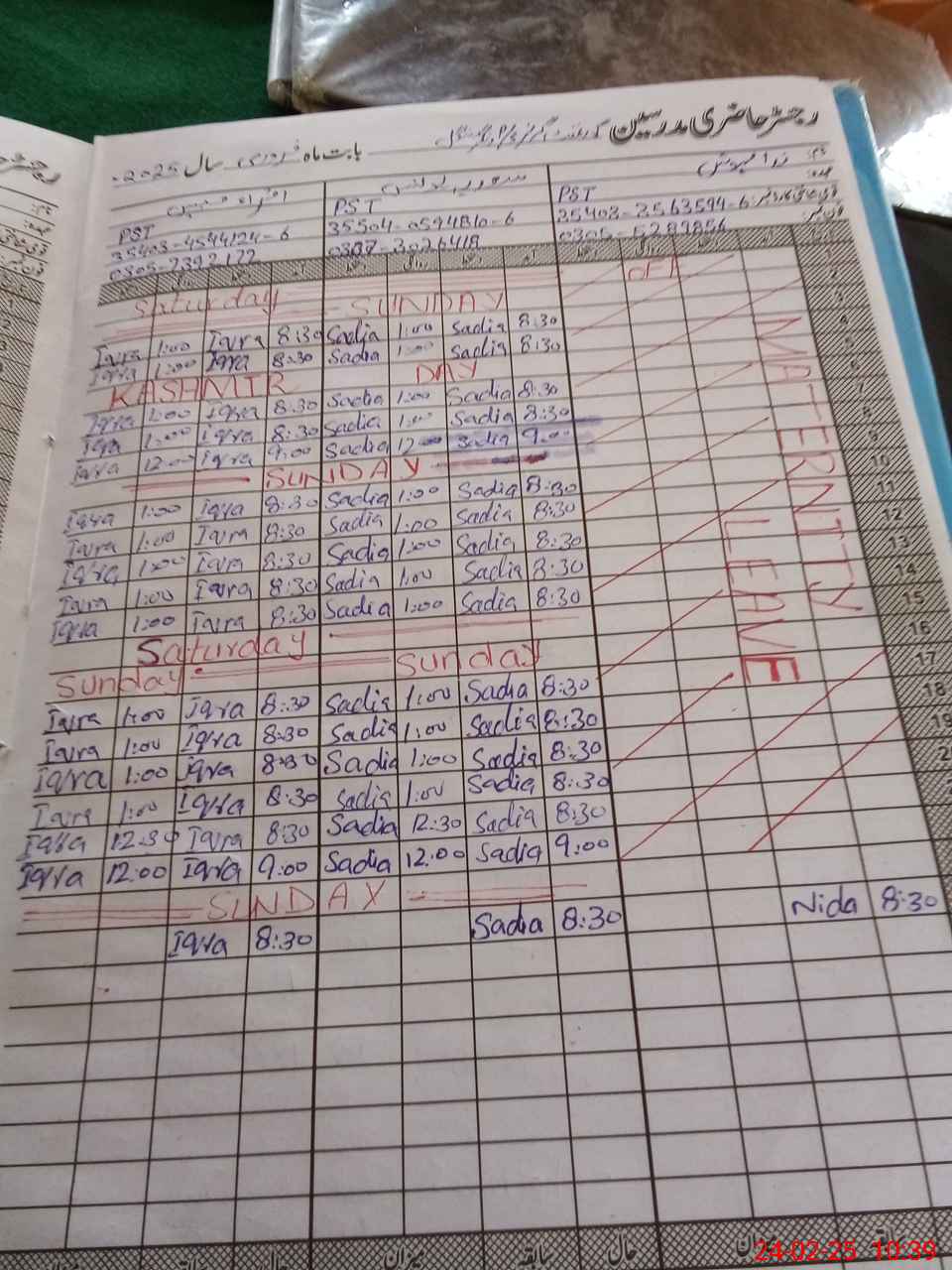 | Leave | Duty | Absent | Maternity | Medical | Ex- Pak |