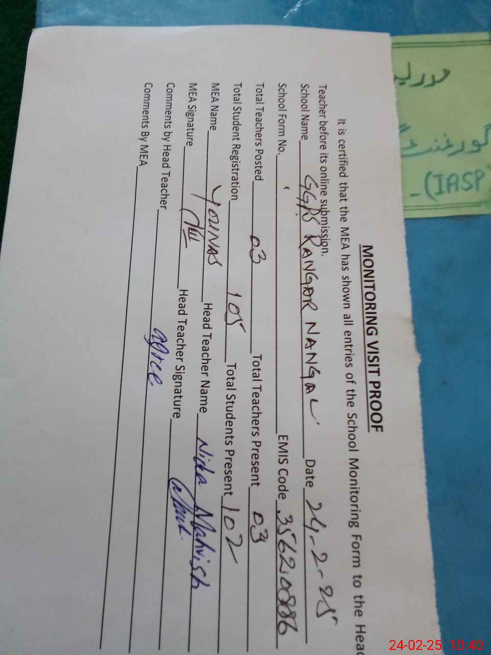 | Attendance Register | Head Teacher | MEA with School | Visit Proof |