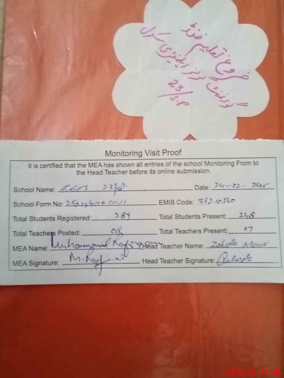 | Attendance Register | Head Teacher | MEA with School | Visit Proof |