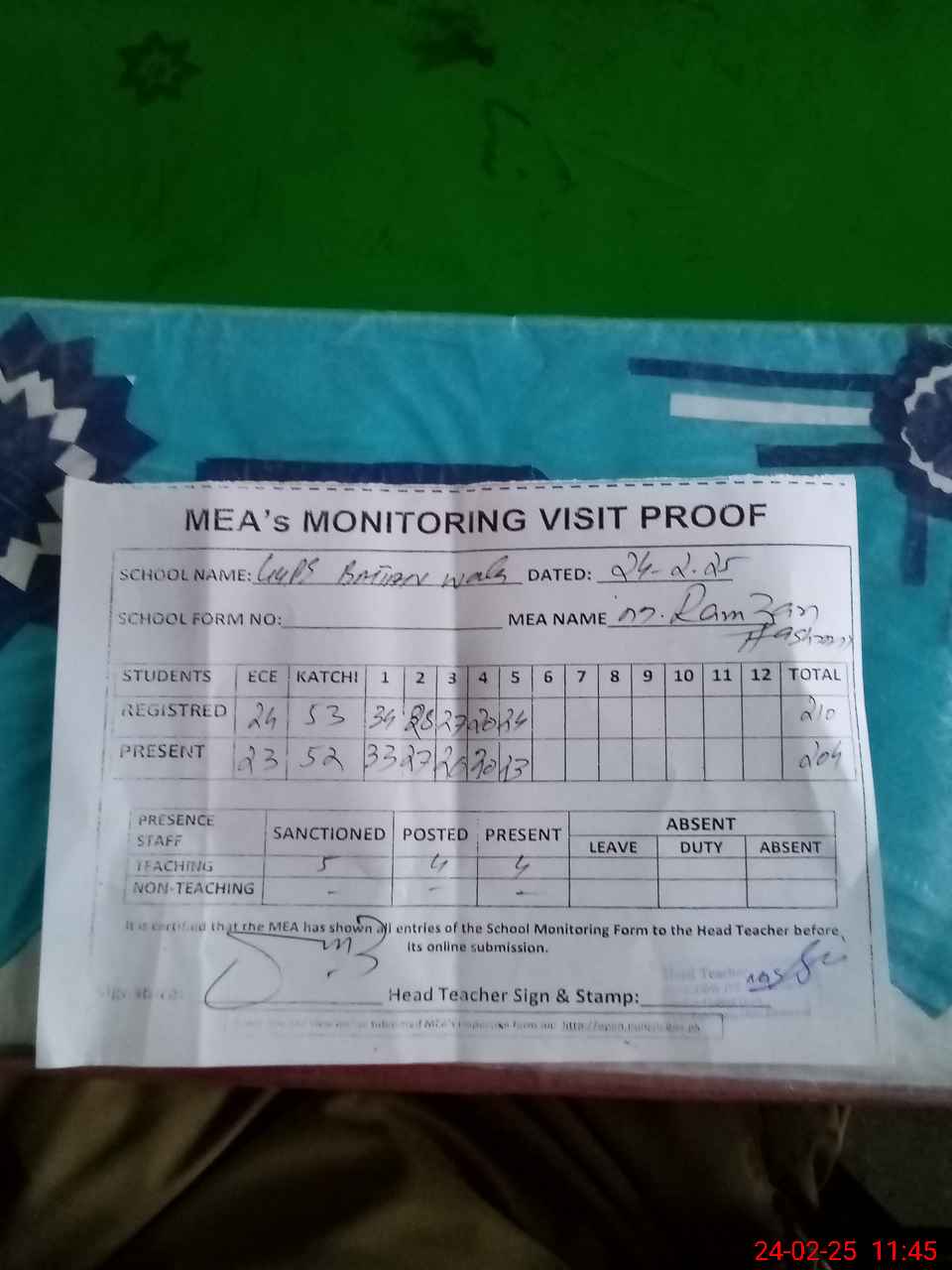 | Attendance Register | Head Teacher | MEA with School | Visit Proof |