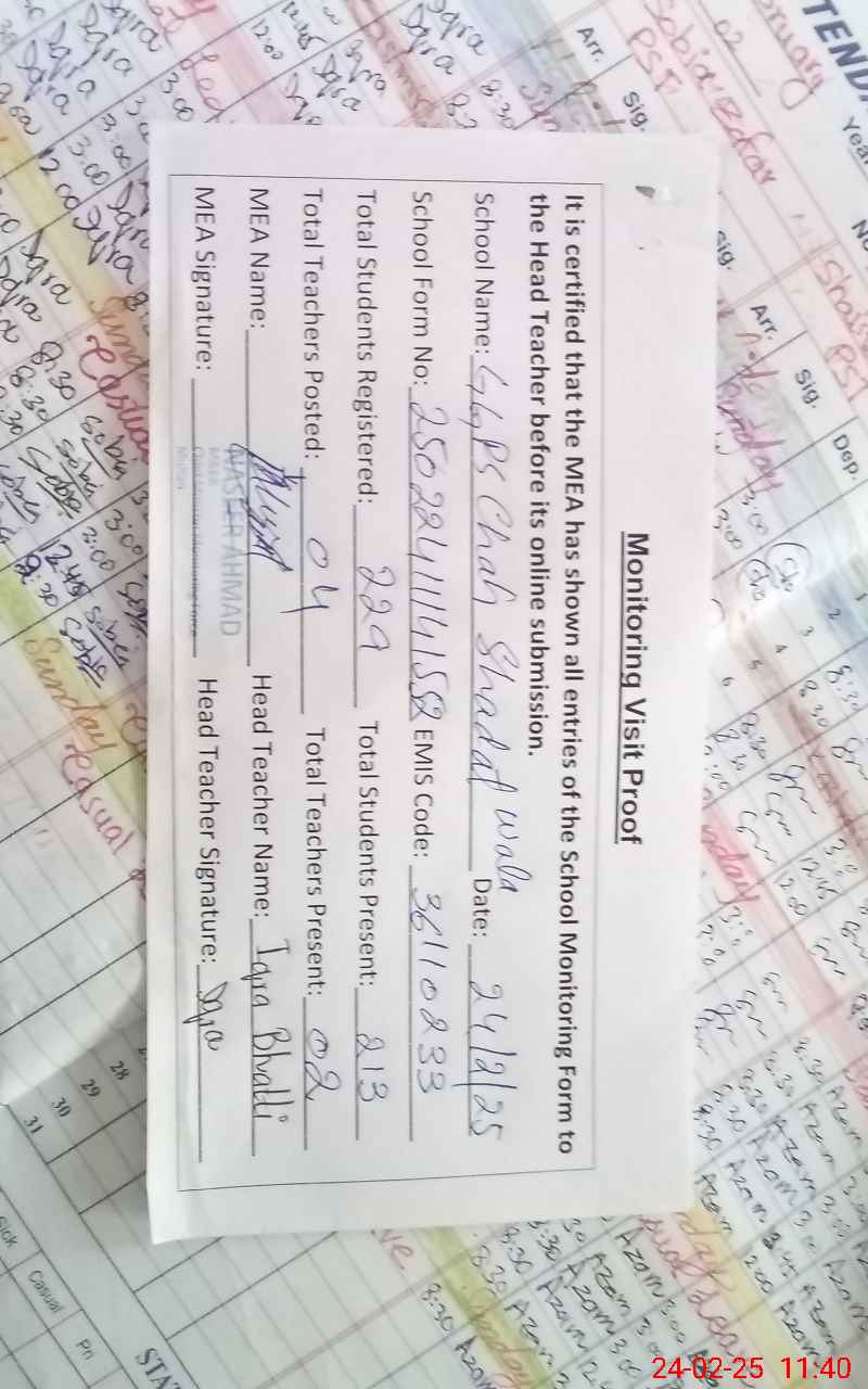| Attendance Register | Head Teacher | MEA with School | Visit Proof |
