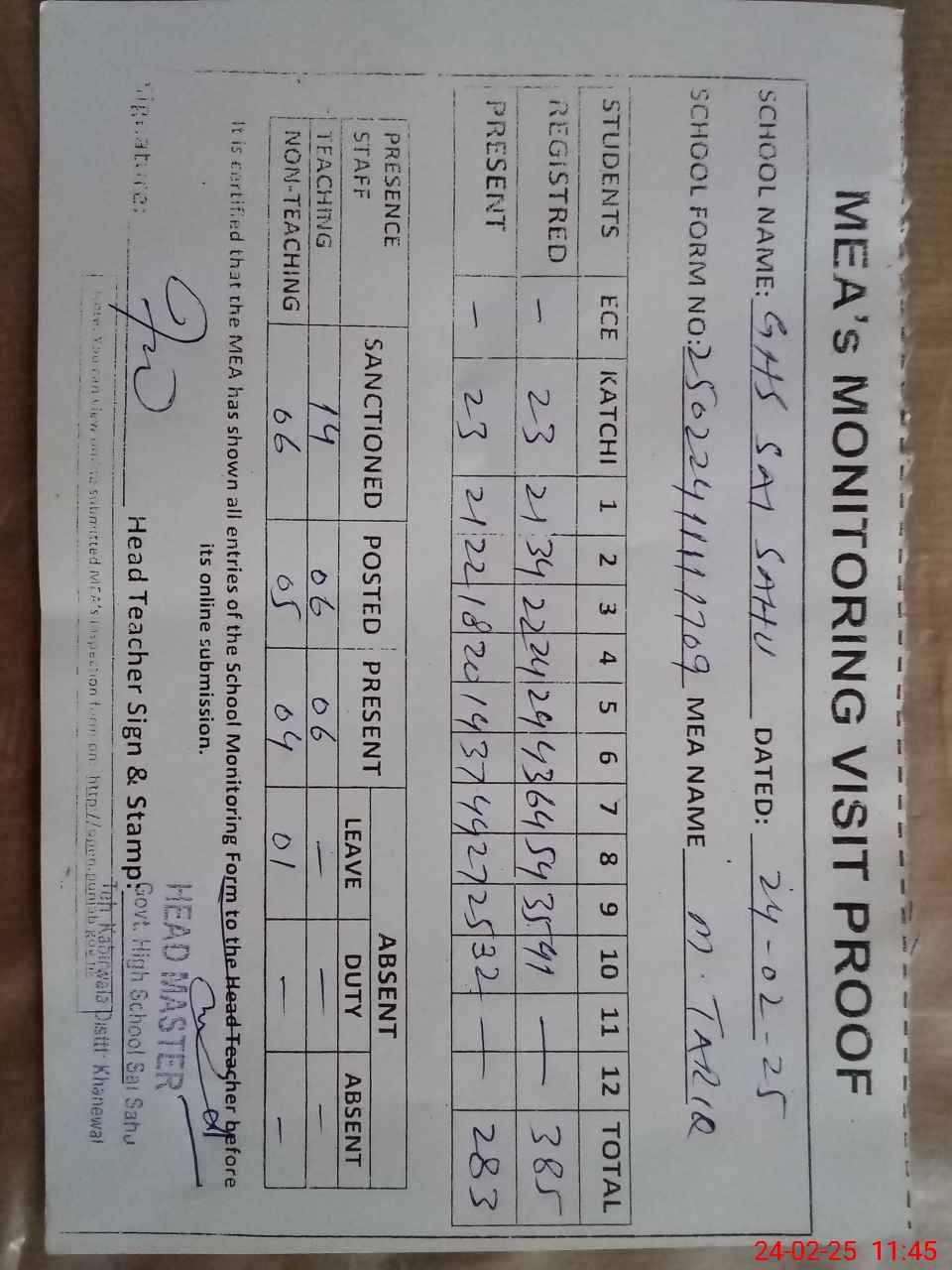 | Attendance Register | Head Teacher | MEA with School | Visit Proof |