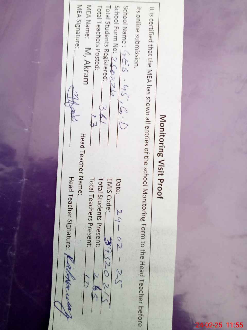 | EMIS Code: 39320215 | Name of School: GHS CHAK 45/G.D | |||