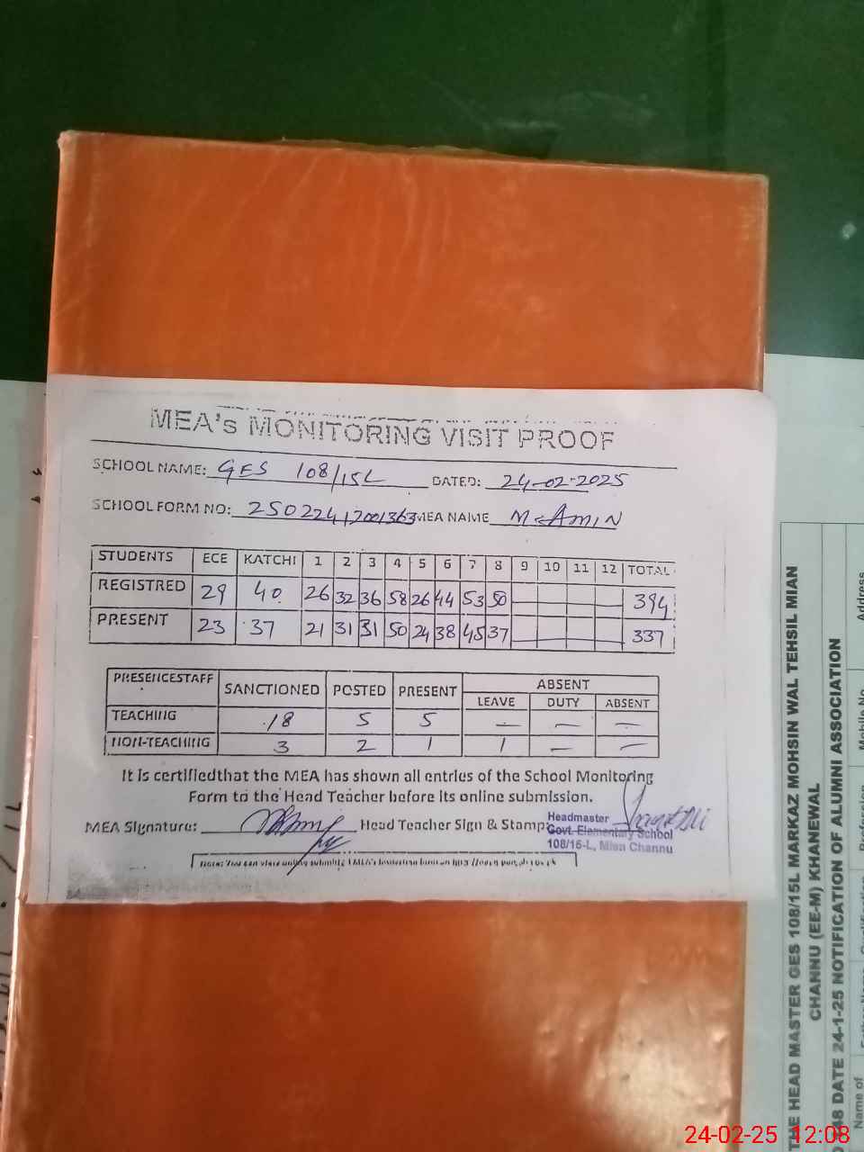| EMIS Code: 36430050 | Name of School: GES 108/15-L, MIAN CHANNU | |||
