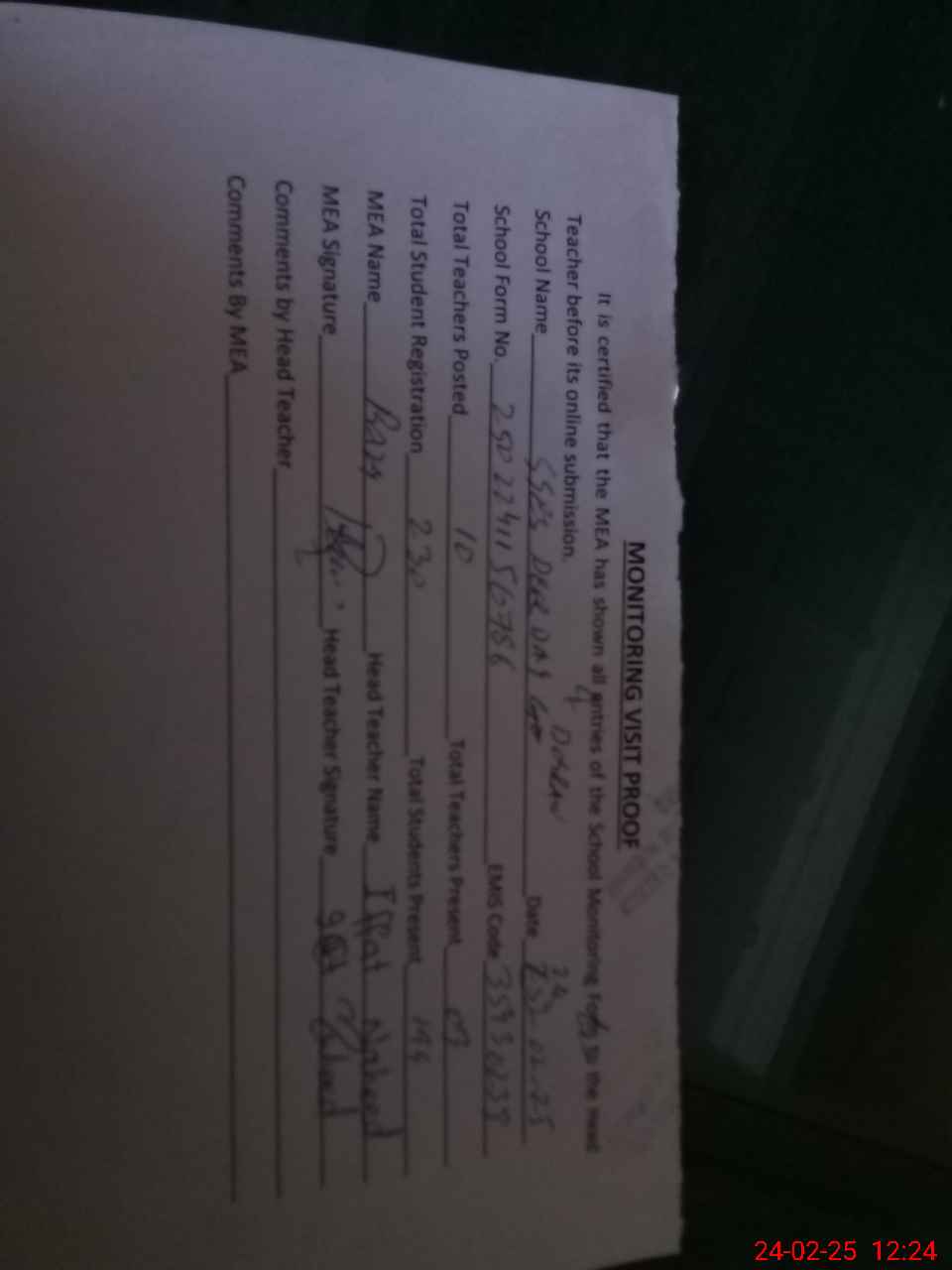 | Attendance Register | Head Teacher | MEA with School | Visit Proof |