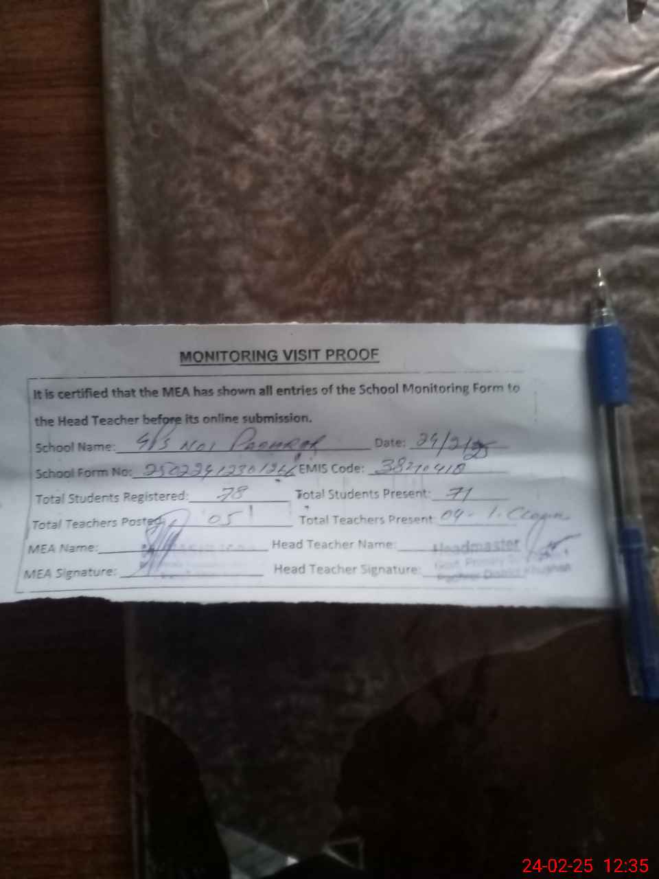 | Attendance Register | Head Teacher | MEA with School | Visit Proof |