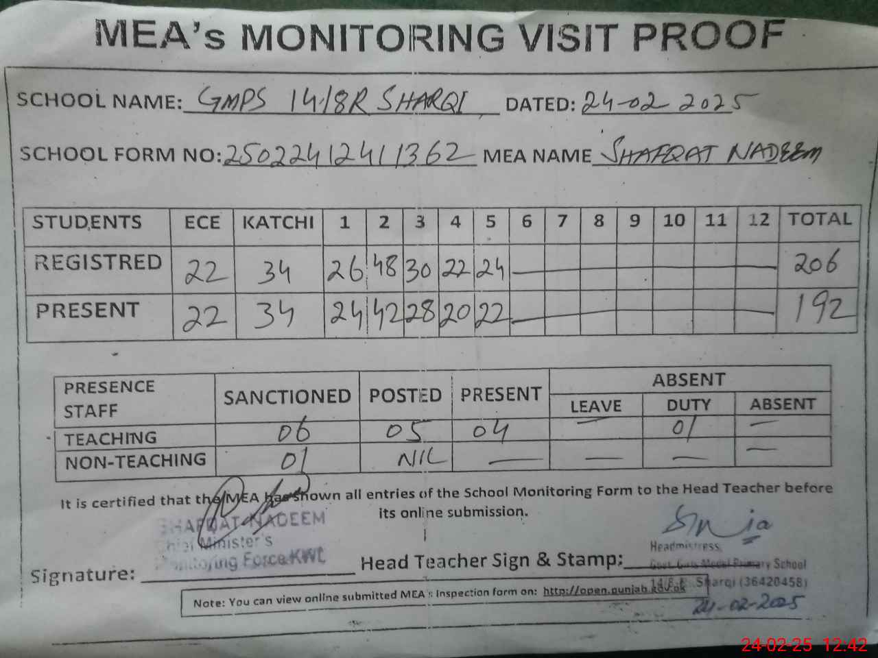 | Attendance Register | Head Teacher | MEA with School | Visit Proof |